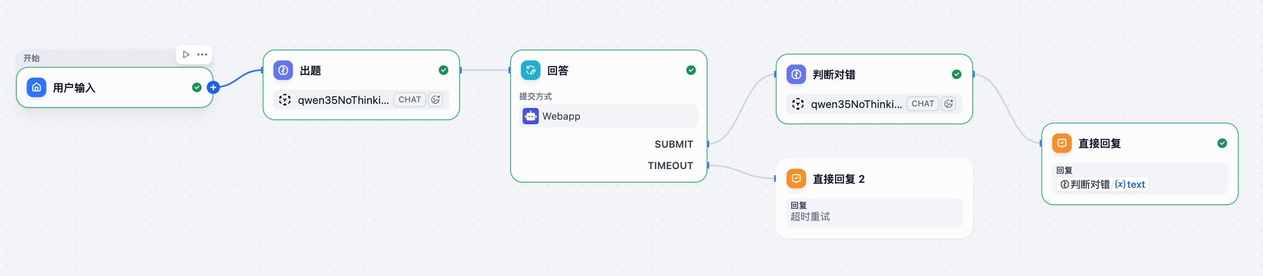 构造一个简单的 人工节点测试.yml 流程,先由 LLM 生成一个计算题,再由人工节点回答计算结果,最终 LLM 判断是否计算正确。